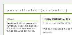 This my blog, parenthetic (diabetic). I ramble on here about life in general, and my life with diabetes specifically.